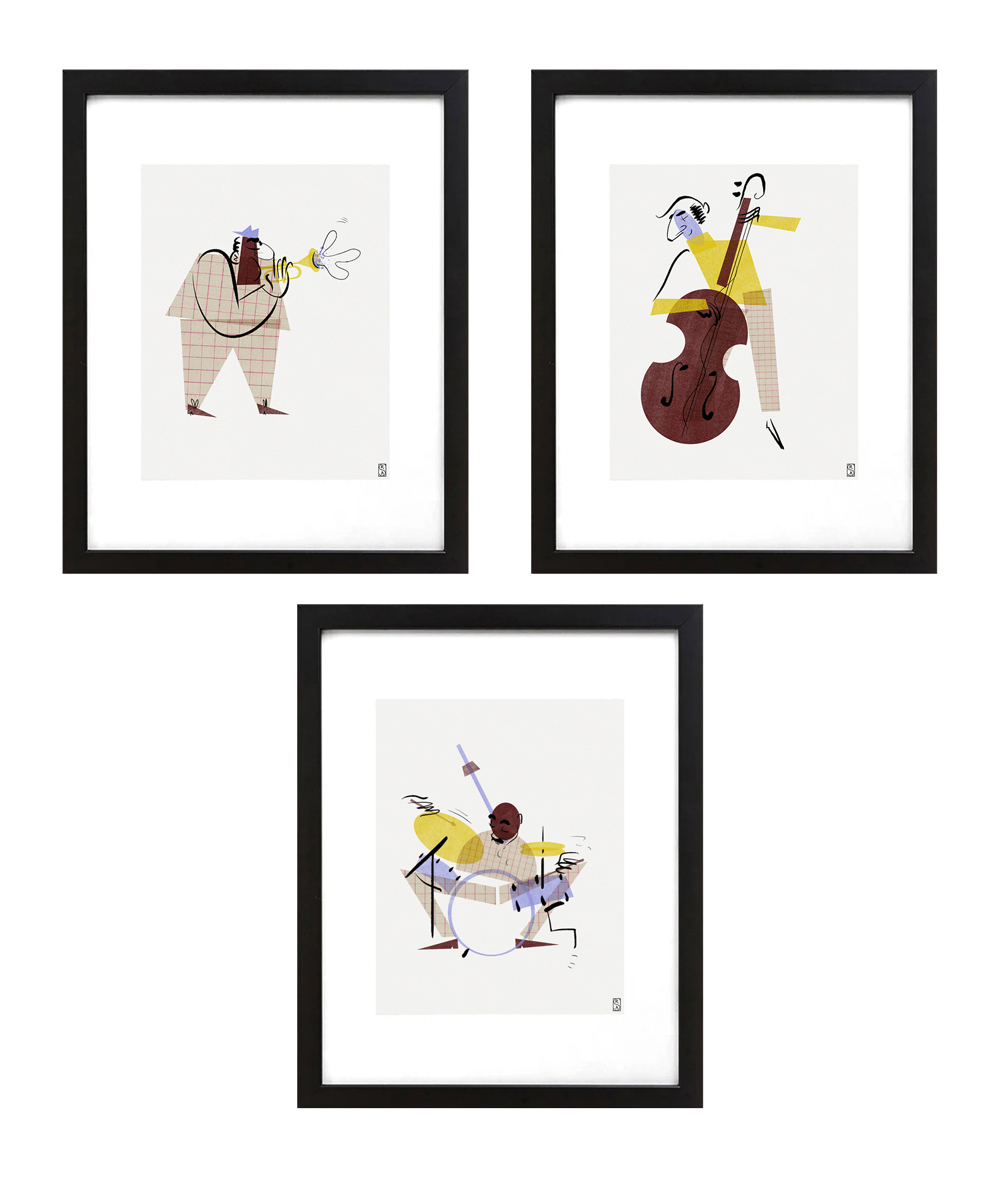 The full set of the Jazz Trio. Signed and framed limited edition prints. These 8x10 inch prints come in a 11x14 inch mat and frame. These prints, when viewed through the Artivive app, will display the animations they are originally from.